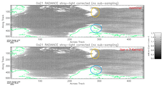 In Section 2.2.2, the positive impact on moon data of the SL correction improvements (iterative method and additional kernels) was presented. Even though stray-light correction performance assessment is more difficult (especially quantitatively) on Earth Observation (EO), the new methods on EO scenes were applied and provided evidence of the expected improvements.