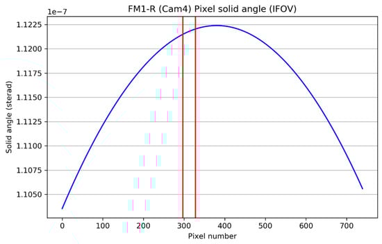 Variation of pixel IFOV along CCD. In observation performed in June 2018, the moon was imaged by pixels between red lines marked on the chart.