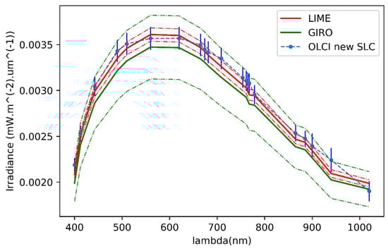 Comparison of absolute irradiance at satellite level with Lunar Irradiance Model ESA (LIME) and GSICS Implementation of Robotic Lunar Observatory (GIRO) models. Dash–dot envelopes indicate expected uncertainty ranges of the model.