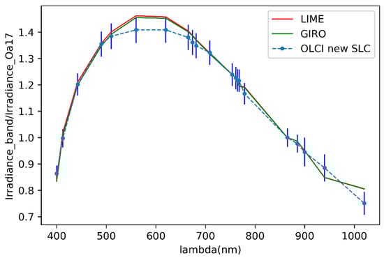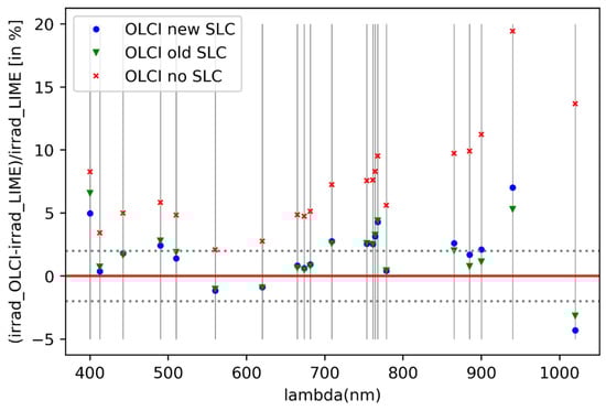 Comparison of OLCI calculated irradiances (with different SLC) relative to the LIME model.