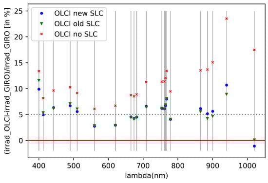 Comparison of OLCI calculated irradiances (with different stray-light correction (SLC)) relative to the GIRO model.