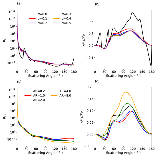 The scattering matrix elements (P11 and −P12/P11) of the solid hexagonal column with a Re of 30 µm as a function of the scattering angle at the 0.87 µm, for different σ with a fixed AR of 0.2 (top panels, (a,b)) and for different ARs with a fixed σ of 0.5 (bottom panels, (c,d)).