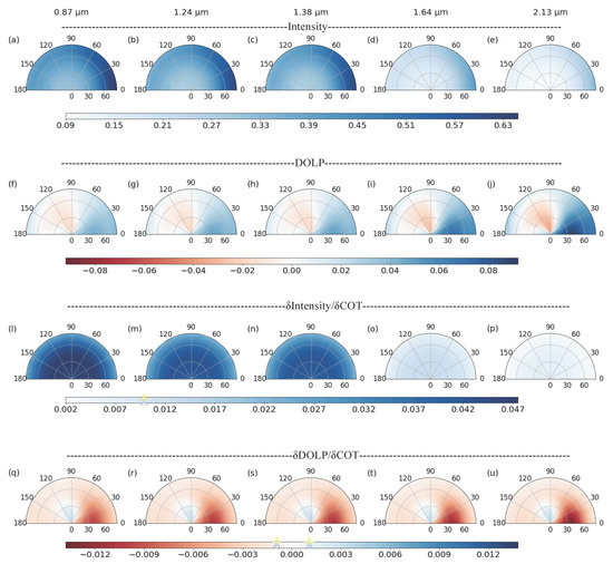Polar plots of the simulated top of atmosphere (TOA) intensity (top panels, (a–e)), TOA degree of linear polarization (DOLP) (second row, (f–j)) and Jacobians of the TOA intensities (third row, (l–p)) and DOLP (bottom panels, (q–u)) with respect to COT at the 0.87, 1.24, 1.38, 1.64, and 2.13 µm channels. All simulations are performed for single layer ice clouds over the ocean surface with an SZA of 40°. The polar radius represents the viewing zenith angle (VZA) ranging from 0° to 80° and the polar angle is the relative azimuth angle (RAA) ranging from 0° to 180°. The pentagrams represent the precisions that can be noticed for the scalar and polarization observations.