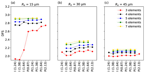 The improvement in total DFS is achieved mainly by the addition of the first- and second-best additions to the two-element measurement vector, and the difference in DFS becomes less significant by including more observations. Considering the different sizes of ice cloud particles, for the six-element measurement vector, the optimal observation combination is found to be I0.87, I2.13, I1.24, DOLP0.87, DOLP2.13 and I1.64. From here on, all simulations and discussions are based on five cases of two- to six-element measurement vectors, as listed in Table 2.