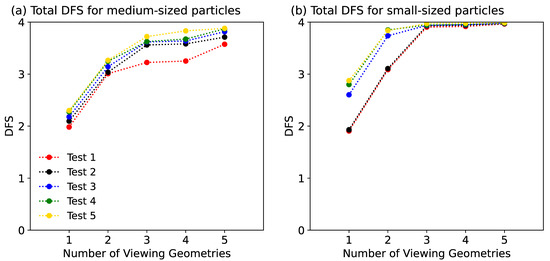 Total DFS of four cloud property parameters with multi-spectral, -angle and -polarization observation combinations, for medium-sized particles (left panel, (a)) and for small-sized particles (right panel, (b)). The x-axis represents the number of viewing geometries and the y-axis represents the total DFS. The corresponding VZA are 20°, 30°, 50°, 60°, 80° and RAA are 80°, 160°, 40°, 120°, 0° with a fixed SZA of 40°.