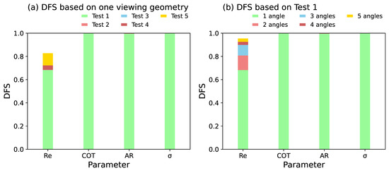 Figure 9 demonstrates the total DFS of four cloud property parameters (Re, COT, AR, σ) for particles with different sizes, where Re is in the range from 1 to 90 µm. Adding either multi-angle or multi-spectral and multi-polarization observations plays a key role in the improvement in the total DFS. In addition, the improvement in the DFS achieved by adding polarization observations (i.e., DOLP0.87 and DOLP2.13) is more obvious when Re is in the range from 1 to 20 µm, as polarization observations are more sensitive to small-sized particles than to larger-sized particles, which is consistent with the previous results. For most particles, the improved DFS from the additional multi-angle observations is more obvious than that from the additional multi-spectral and multi-polarization observations, which can be seen from a comparison of the DFS of Test 5 in single-angle mode with the DFS of Test 1 in 5-angle mode.
