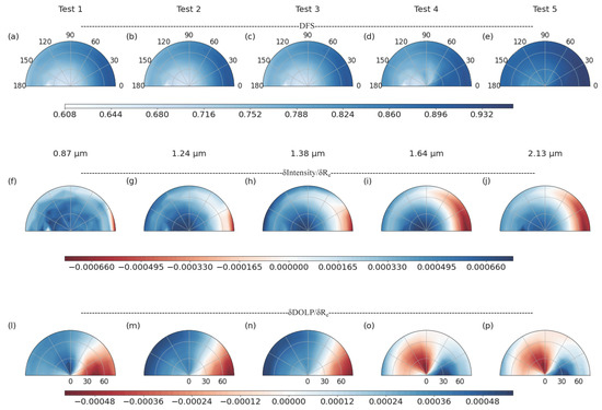 Polar plots of the DFS for ice cloud particle effective radius (Re) in single-angle mode with different observation combinations (top panels, (a–e)), intensity Jacobians (second row, (f–j)) and DOLP Jacobians (bottom panels, (l–p)) at the TOA with respect to Re at the 0.87, 1.24, 1.38, 1.64, and 2.13 µm channels. The polar radius represents VZA from 0° to 80° and the polar angle is RAA from 0° to 180°.