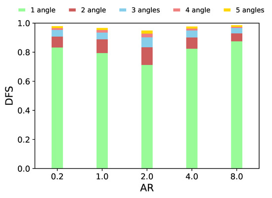 DFS of cloud particle effective radius (Re) for ice cloud particles with different ARs for optimal observation combination (Test 5). Colored bars represent different numbers of viewing geometries. The x-axis represents ice cloud particles with different ARs and the y-axis means Re DFS.