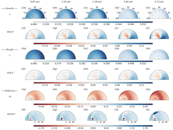 Polar plots of the simulated TOA intensities (1a–1e) and TOA DOLP (1f–1j) for smooth particles, the simulated TOA intensities (2a–2e) and TOA DOLP for severely rough particles (2f–2j), and the relative difference in the TOA intensities (Ismooth − Irough)/Ismooth (3a–3e) and TOA DOLP (DOLPsmooth − DOLPrough)/DOLPsmooth (3f–3j) at the 0.87, 1.24, 1.38, 1.64, and 2.13 µm channels. The polar radius represents the VZA from 0° to 80° and the polar angle is the RAA from 0° to 180°.