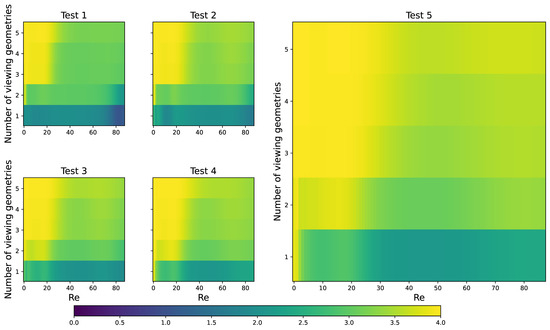 We investigate the Re DFS in more details. The angular distributions of the Re DFS with different observation combinations in single-angle mode are shown in Figure 6. Consistent with the finding reached from Figure 5, adding I1.64 and DOLP2.13 is the key to increase the Re DFS. When DOLP at the 2.13 µm channel is included (Test 4), the improvement of the DFS is observed mainly at viewing angles opposite to the solar incident (Figure 6d). This is owing to the larger DOLP Jacobians near these angles (Figure 6p). The same analysis can be applied to the increase in the Re DFS around the backscattering directions when adding observation of I1.64 in Test 5 (Figure 6e,j). In summary, the improvements in Re DFS with the addition of multiple intensity or DOLP observations are consistent with their larger intensity or DOLP Jacobians with respect to Re.