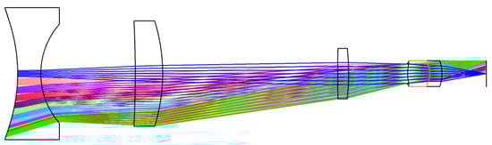 Optical design of the SW camera. The total axial length equals 85.5 mm. The system consists of three singlet lenses and an achromatic doublet. The aperture stop is situated at the front side of the achromatic doublet. The square detector has a size of 4.92 mm × 4.92 mm. The half FOV is 70°. The sampling of the 12 fields (12 different colors) has been chosen, such that they are separated by the same angle of 6.36°.
