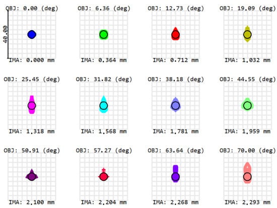 In Figure 1, the different colors correspond to the different fields between 0° and 70°. The full FOV is circular and equals 140°. To evaluate the performance of the camera system, we consider the spot diagrams shown in Figure 2. The spot size is simulated for different fields between 0° and 70°, corresponding with the different colors in Figure 1. In Figure 2, the black circles correspond to the Airy disks. When optimizing the optical design, the aim is to match the spot size with the Airy disk, in order to obtain a near-diffraction-limited optical design. Table 2 indicates that the spot sizes approximate the Airy disks for all fields, except for fields 5 and 6, where the spot sizes slightly exceed the Airy disk size, due to a larger amount of aberrations.