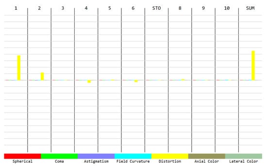 Five Seidel aberrations and (axial and lateral) chromatic aberrations. The main aberration is the barrel distortion, mainly induced by the first surface. This aberration is illustrated in more detail in Figure 4.