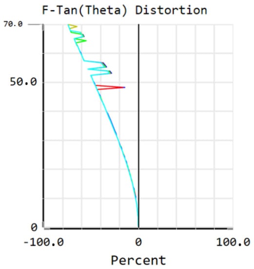 Regarding the Seidel aberrations, the major contribution comes from distortion (Figure 3). Additionally, it appears that the distortion is mainly induced by the first lens surface, which is aspherical. While this surface enables us to avoid other aberrations, it is the main contributing factor to the distortion. This is because, as stated in Section 2.1, there is no particular requirement on the distortion, since it can be measured during pre-flight characterization, and can be taken into account during the in-flight processing. Among the aberrations that are presented in Figure 3, the dominant aberration is the distortion, which is a common aberration in wide-field imaging systems since this aberration generally increases with the field. Figure 4 gives us a better understanding of the amount of distortion that is present in the optical system. It presents the total distortion (in %), showing that distortion is maximal at 70°, where it equals 74.6%.