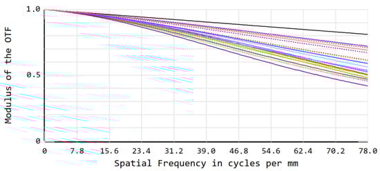MTF ≥ 0.4 at 78 cycles/mm. The top black line corresponds to the diffraction limit, and the colors correspond to the different fields, similarly to those presented in Figure 2. Full lines and dashed lines correspond to tangential and sagittal planes, respectively.