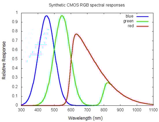 Synthetic spectral responses of the Red, Green, and Blue components of a CMOS camera. The Red, Green, and Blue channels have peak sensitivities above 600 nm (Red), near 550 nm, and above 800 nm (Green), near 450 nm, and above 800 nm (Blue).