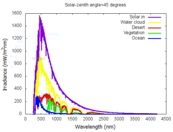 The simulated spectral fluxes for the scene types ocean, vegetation, desert, and water cloud for a solar-zenith angle of 45° are illustrated in Figure 7. The spectral shape of these radiation fluxes are quite different, with e.g., a peak in the blue region (below 500 nm) for the ocean scene, a peak in the red region (around 700 nm) for the desert scene, and a peak in the near infrared (above 700 nm) for the vegetation scene. These differences, combined with the detector spectral responses of Figure 6, will determine how accurate the broadband albedo can be estimated with Equation (6).