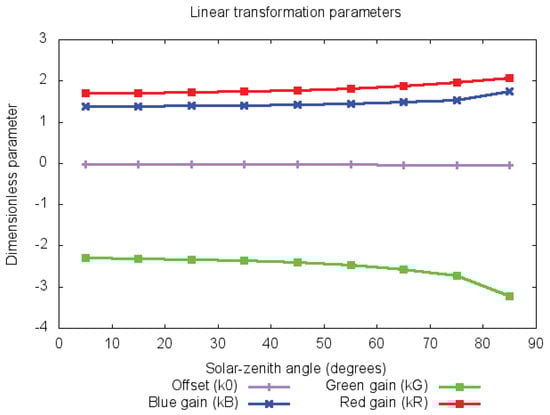 where the four regression parameters , , , and are the offset, the red gain, the green gain, and the blue gain, respectively. This linear regression is inspired by the so-called slope-offset method used in the Clouds and the Earth’s Radiant Energy System (CERES) processing [20].