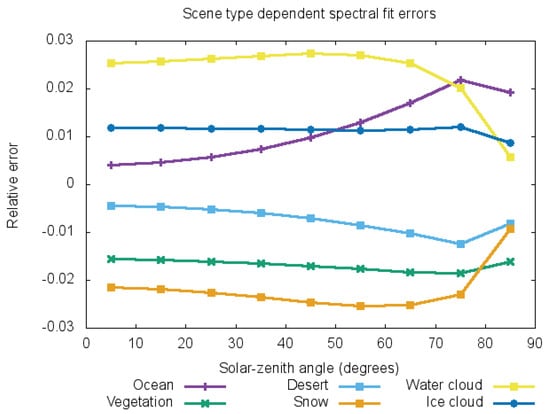 Using the fitted parameters , , and , the error on the estimate of the broadband albedo , as defined by the Equation (6), is evaluated as a function of the solar-zenith angle , for all scene types of Table 3. The resulting broadband albedo regression error is illustrated in Figure 9. From this figure, we conclude that the broadband albedo error is lower than 3%. This is better than our target, which was a maximal error of 5% [10].