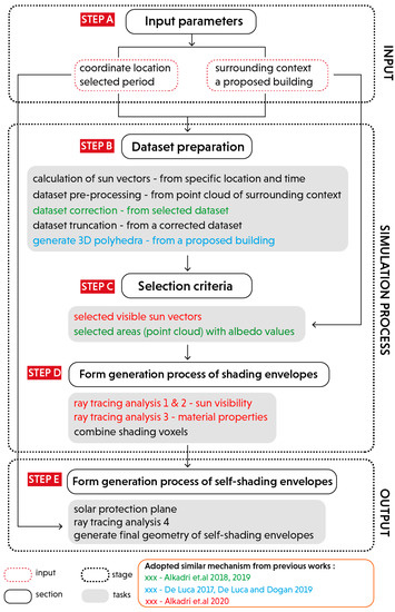 This section focuses on translating the raw datasets into a simulation model by examining three main steps (i.e., dataset preparation, selection criteria, and form generation process of shading envelopes). Each step serves specific actions that are performed sequentially based on specific computational tasks. As illustrated in Figure 1, this section adopts several workflows that are partially implemented from previous works. For example, pre-processing point cloud datasets and the calculation of material properties (i.e., albedo values) are indicated with a green text [67]. These works focused on developing a material database of existing contexts and solar radiation analysis based on a small sample of point cloud data. Next, 3D polyhedra and sun visibility analysis are illustrated in the blue text [49,50]. These works primarily investigated a voxel-based generative design of subtractive solar envelopes based on 3D and parametric modeling. Last, the ray-tracing analysis between a proposed building and point cloud data of surrounding contexts is illustrated in the red text [56]. This work refers to a form generation of subtractive solar envelopes that consider surface properties of existing contexts based on geometric and radiometric information of point cloud data. While these previous works address different objectives, some features are still relevant for supporting an integrated design concept and computational workflow for establishing the subtractive shading envelopes.