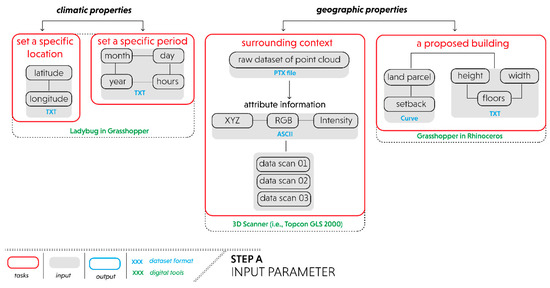 On the other hand, geographic properties include surrounding contexts (i.e., existing buildings and vegetation) and a geometric model of the proposed building. In this regard, the surrounding context contains a 3D point cloud data of the existing environment. As a raw dataset, its format properties often rely on the type of 3D scanner, but as long as the required attribute information (i.e., XYZ, RGB, and reflection intensity) is legible, any raw dataset formats are acceptable (i.e., PTX file). Meanwhile, several parameters, such as height, width, floors, setback, and building function, must be established to generate an initial 3D envelope for a proposed building. These inputs are then executed into the following Step B (dataset preparation) based on corresponding parameters and tasks.