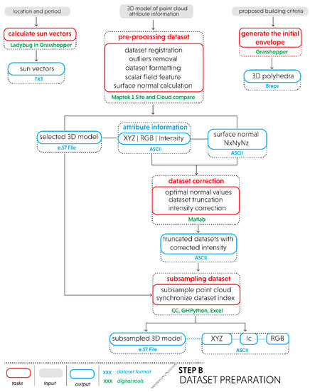 - The dataset preparation includes pre-processing and correction steps that help architects minimize the environmental effects of the dataset measurement during scanning and to select reliable and relevant information for the contextual analysis and the simulation process.