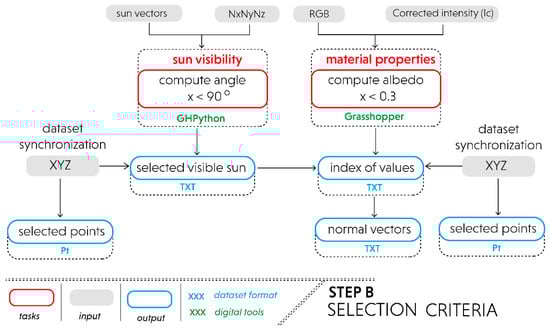 On the other hand, material aspects are used to measure the performance behavior of the existing site’s surface properties. This allows architects to identify susceptible areas that may affect the geometrical performance of the proposed design. This study specifically computes albedo values to detect the absorbance percentage of solar energy on surrounding contexts by considering the RGB color and corrected intensity (Ic) of contextual datasets. A detailed procedure regarding the calculation of albedo values can be found in our previous research [67]. Furthermore, the resulting albedo values are filtered based on the threshold below 0.3. Although this setting indicates the low albedo, it can be used not only to identify areas that contain a high level of heat absorbance, but also to analyze and mitigate microclimatic impacts of the surrounding areas especially related to thermal issues and urban heat island (UHI) effect. In order to avoid that, these areas need to be blocked from direct sun exposures by excluding the indicated surfaces with high albedo values. Afterward, the resulting indexes of low albedo values (below 0.3) are synchronized not only with selected normal vectors from the sun visibility to register the corresponding normal surface of the dataset, but also with XYZ attributes to select the matching points within the dataset.