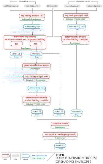 On the other hand, De Luca [49,50,51] and Darmon [52] have proposed a similar subtractive mechanism based on the performance criteria of solar envelopes or so-called subtractive solar envelopes. This approach specifically involves sun visibility that aims to evaluate sun vectors from a predefined shadow grid of surrounding building windows without any obstruction from other existing buildings. In parallel, ray-tracing analysis is performed from surrounding windows to the voxels within the 3D plot using a Boolean expression (true or false statement). In this operation, the true statement will be executed when sun vectors hit or intersect the 3D polyhedra, and accordingly, the voxels subtraction procedure to the 3D polyhedra can be performed. Meanwhile, the false statement indicates an unsuccessful intersection. This condition means that voxels that are not intersected may contribute to the generation of geometric solar envelopes.