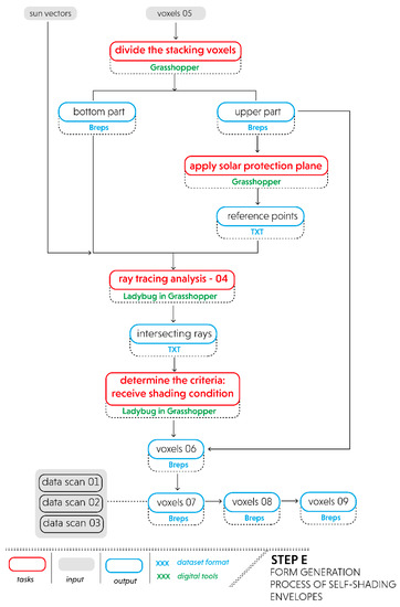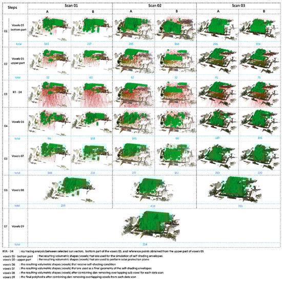 As a last stage of the computational workflow, the output contains final tasks to generate a geometric configuration of self-shading envelopes (see Figure 6). The first task begins with selecting the upper part of the stacking voxels. This upper part acts as a roof or shelter to guarantee a shading condition for all properties under its envelope within a predefined period. Afterward, a solar protection plane can be applied on the bottom surfaces of the upper part of the voxels. It aims to establish reference points that are used as the basis for ray projections. Furthermore, the ray-tracing analysis-04 is performed by considering inputs from reference points of the upper voxels, the remaining stacking voxels (i.e., bottom part), and initial sun vectors calculated for the analysis period under consideration. This simulation will evaluate the remaining voxels by maintaining the one that receives a shading condition while removing the unshaded voxels. The resulting voxels (refer to voxels-06) are then combined with the upper voxels to establish the geometric envelope for each data scan (refer to voxels-07 and voxels-08). After identifying self-shading voxels for each data scan, the final step is to combine all these voxels into a final geometric envelope that represents a final configuration of envelopes (refers to voxels-09).