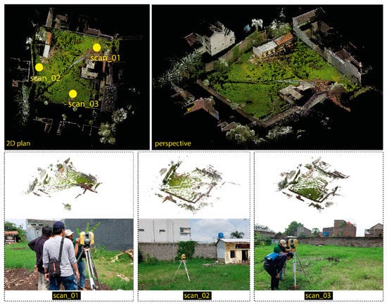 This tool’s performance specifications allow the dataset collection with only three single scans to capture a sufficient scene for the selected site (see Figure 7). With these three single scans, the dataset’s computational performance simulation can also be more manageable and relevant to the currently proposed workflow. Given that this approach is part of the exploratory study, architects need to select not only important information, but also a degree of detailed properties that are relevant to the simulation. In this regard, the setting of each scan approximately consists of four million points per scan within five minutes with a resolution 12.5 × 12.5 mm @10m. The distance between scanners and the designated objects are principally determined based on the approximate coverage of the scanner capacity, which may cover 360° of the horizontal field of view (FOV) with the distance for single-point accuracy 1–150 m. In this case, Scan 2 reaches the closest distance between the scanner and the object with 2.75 m. This is because data scan coverage areas need to capture the surrounding wall and corner spots behind the temporary shelters. Meanwhile, the longest distance is obtained by Scan 01 with 34.9 m, due to the diagonal position of the scanner to the corner of the site. Besides, in this dataset collection, it is worth noting that as long as the entire scenes of the selected site and relevant objects are covered, the scanner can be located at any appropriate distances.