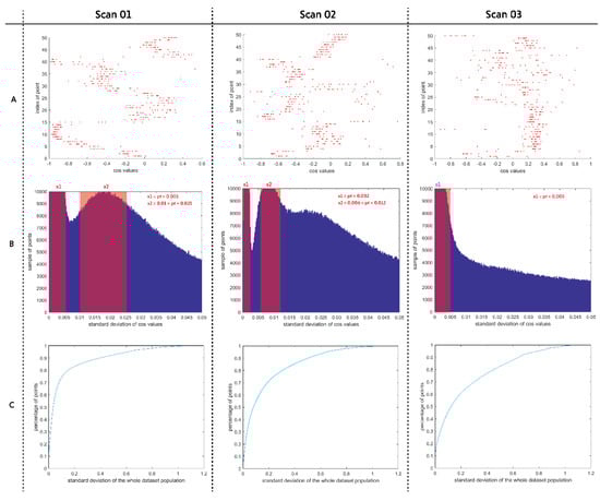 Dataset correction (A). Point distributions based on cosine values of each incident angle (B). The standard deviation of cosine values based on a group sample of points (C). The standard deviation of the whole dataset population.