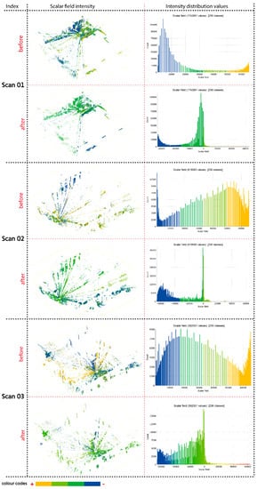 Figure 10 specifically demonstrates the result of intensity correction from the raw attributes to the corrected one through the scalar field of intensity and intensity distribution values. The dataset transformations of each scan are plotted based on four-color steps, ranging from blue to yellow, which represent the lowest and the highest intensity values. The threshold between these values is represented by light and dark green. The trend clearly shows that the raw intensity of all data scans contains yellow areas (refers to the “before” part), representing high reflective surfaces. However, these areas predominantly assign incorrect surface materials as it should be. For example, some parts of the buildings, such as wood façade and clay roof tiles, are attributed to yellow intensity. In fact, these materials principally contain a high level of emissivity value or low intensity, which means that the return incident energy from these materials to the scanner is highly decreased, due to its spectral reflectance mechanism on rough, dark, and dull surfaces [81]. In addition, the intensity correction also compensates for scanned areas around the scanner, due to the impact of the brightness level of intensity. These areas are massively indicated with yellow-coded values, due to the high level of intensity produced by the scanner at a very short distance. In this case, the scanner’s brightness reducer is assumed not entirely and comprehensively applied in these areas, especially within the distance range of 10 m from the scanner position. This is because some local constraints, such as atmospheric variables (i.e., humidity and temperature pressures) and surface roughness of the objects, may influence specular and diffuse reflection of the laser pulse during scanning [54].