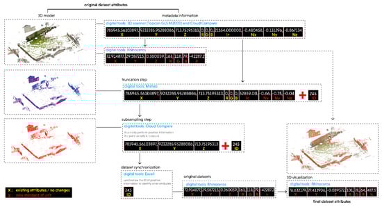 The corrected datasets are then performed with the subsampling procedure in CC in order to control the unstructured point density when it comes to the simulation. In this case, the distance between points is set to 0.05 or equal to 5 cm, which results, on average, in a decrease point, up to 70% of the truncated datasets. This procedure, however, only works on position information (XYZ) because it can cause interoperability issues when it transforms into the 3D model in Rhino, due to the different nature of the algorithmic operation. To tackle this issue, index information of each point (refers to ID in Figure 11) needs to be extracted beforehand during the truncation process and then used to synchronize the original attributes (i.e., XYZ and RGB) with the corrected ones in the 3D model. The workflow of this dataset transformation is illustrated further in Figure 11.