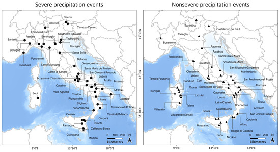 Spatial distribution for the collected severe (circles) and nonsevere (triangles) precipitation events.