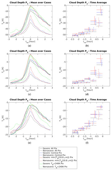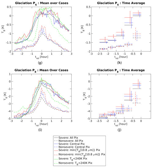 Time series of indicators P1 (a,b), P2 (c,d), P4 (e,f), P6 (g,h) and P8 (i,j) from Table 3 for convective events leading to severe (solid line) and nonsevere (dashed line) precipitation. The mean over cases (left column, Equation (1)) and the time average over 30 min intervals (right column, Equation (2)) up to 2.5 h before trel = 0, are computed for separate clusters of pixels within the box, namely all (black), central (blue), lowest brightness temperature at 10.8 μm within the reference hour (red) and TB < 240 K (green) pixels. Vertical bars are standard deviation based on Equation (3). Time average for TB < 240 K pixels and standard deviations for all pixels analysis are not necessary in our study, hence these are not shown in the graph.