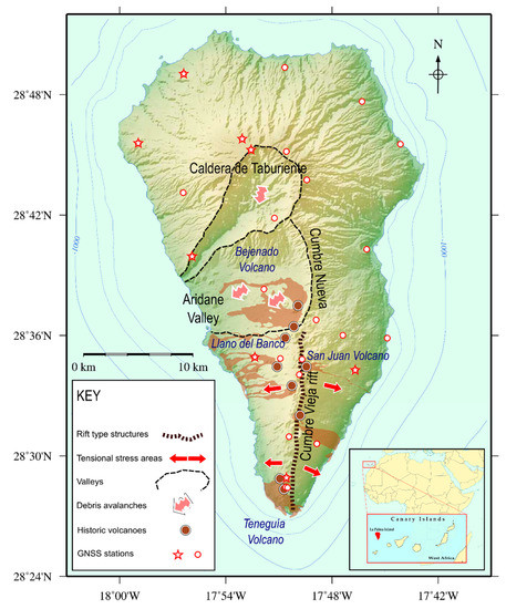La Palma is a salient example of a steep-sided composite volcano [23]. Its volcanic edifice rests on the oceanic crust at a sea-floor depth of 4000 m, and the subaerial topographic elevations reach around 2500 m. It is a triangular shaped island with dimensions of 45 km from north to south and 27 km from east to west at its widest part (Figure 1). It has an area of 708.32 km2. The structural and geological development of La Palma is complex, with interactions between large intrusions linked with effusive episodes inserted between periods of erosional gap, together with gravitational mass-wasting phenomena [24]. At least two debris avalanches have occurred in La Palma [25,26,27]. Cumbre Vieja is the last volcanic expression of a succession of growing and overlapping volcanic centers in La Palma.