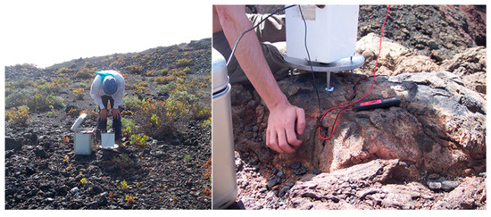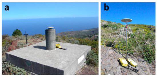 In addition to all these areas, the GNSS monitoring network covers the entire island with 26 GPS stations [28], as shown in Figure 1. There are two different types of geodetic network markers. The first type corresponds to the stations belonging to the former IGN network which consist of 1.20-m concrete pillars on top of a 1.00 m square concrete foundation anchored to the rock (Figure 2a). The pillars are equipped with a centering device that allows us to set the GNSS antenna with repeatability of over 1 mm. The second type of monumentation of the new monitoring stations consists of a benchmark steel bolt anchored to the rock (Figure 2b), as used routinely in other geodetic studies [38].