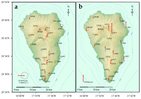 Annual mean velocities for the GNSS monitoring stations on La Palma Island with their uncertainties for the period 2006–2011: (a) horizontal annual mean velocities; and (b) vertical annual mean velocities.