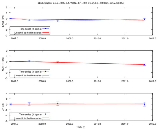 3D GNSS displacement time series and adjusted linear fits for the JEDE station. This station was used as one of the velocity seeds with zero cm/year (in LOS projection) for A-DInSAR processing of descending orbit images. The red lines on the subfigures show the linear fit to the time series used to estimate the mean annual velocities.