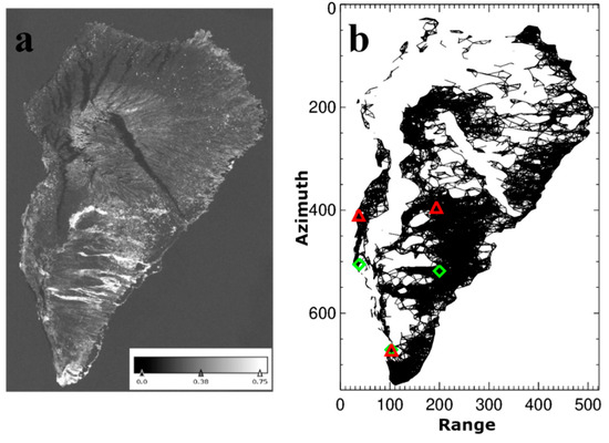 (a) Mean coherence map for a multilook of 15 lines in azimuth and three samples in range for the island. White areas represent high coherence zones and dark areas represent low coherence zones. (b) Selected pixels that met the coherence criteria and the Delaunay triangulation between them. Velocity and DEM error seeds are marked as a rhombuses and triangles, respectively. Note that these images are in radar coordinates, and there is a mirroring effect along the horizontal axis due to the acquisition geometry in descending orbit.