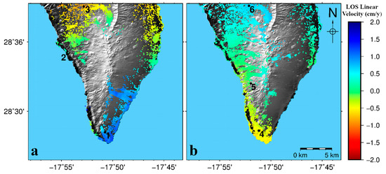 It is interesting to note that, in the areas where the A-DInSAR results were obtained using ascending and descending radar images, the A-DInSAR results sometimes have a different sign for the LOS velocity in each geometric configuration. The signs of both LOS displacement velocities agree for the western flank of the Cumbre Vieja volcano, but they differ for the Teneguía volcano and Aridane Valley areas (see Figure 5). This is a very rough estimate because the LOS depends heavily on the look angle.