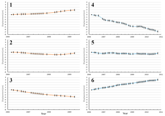 The next step in our study consists of atmospheric filtering, calculating nonlinear displacements, and estimating statistical errors [52]. The final result is the time series of LOS displacements with an error estimation for each selected pixel in the region of interest. We selected three pixels for each geometry to show the results (see Figure 6 and Figure 7). Pixels 1 and 4 present the maximum displacement rates on the flank of the Teneguía volcano. Pixels 2 and 5 are located in a stable zone during the period considered, on the western flank of the Cumbre Vieja volcano, with close to zero displacement. Pixels 3 and 6 are located in the northern part of the study area, in the southern part of the Cumbre Nueva volcano in the Aridane Valley, and also show significant LOS displacements.
