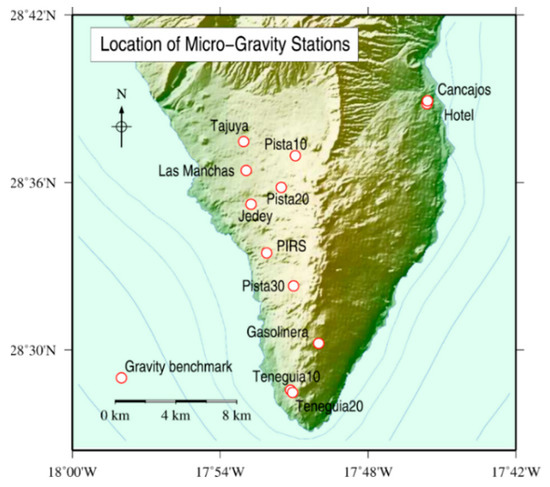 To detect any possible signals related to additional masses or mass redistributions under the surface of La Palma, and taking into account the results reported in the literature [5,6,28,30,31], a micro-gravity network consisting of 12 stations was established in the SW part of the island and measured for the first time in June 2008 [35]. The geographic locations of the stations are shown in Figure 8, while their altitudes are represented in Figure 9. Coordinates are given in Table S5.