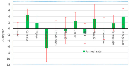 Figure 11 shows the estimated annual rate and standard error for each of the 12 gravimetric stations in the network. It can be seen that the adjusted annual rate values and the standard error values are generally small. Two stations have values exceeding the standard error: Pista 20 (6.5 ± 4.5 μGal/year) and Cancajos (4.6 ± 2.0 μGal/year), although neither clearly exceeds twice the value of the standard error. This points to two conclusions: (1) the quality of the gravimetric network is acceptable (estimated standard errors of the order of ± 5 μGal/year for the annual rate values and mean root square residual of 5.9 μGal), although perhaps insufficient due to the small magnitude obtained for the variations measured; and (2) none of the adjusted annual rate values is significant. No significant variations in gravity are therefore detected in the gravity network, at least at the level of precision obtained.
