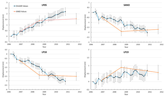 Because SAR is sensitive in the perpendicular direction to its azimuth and the satellite moves along an almost polar orbit, the LOS displacement can be assumed to be produced by vertical and E–W motion, and the N–S motion is neglected. To obtain the vertical and E–W components of the displacement, the ascending and descending LOS motions must be combined in areas where both are present [8]. However, if we consider the magnitude of the displacements observed using A-DInSAR and GNSS (Figure 3 and Figure 6), it is clear that the computation of this decomposition will not produce good (i.e., sufficiently precise) results due to methodological aspects, as well as because the magnitude of the E–W motion is at sub-centimeter level in many of the coherent pixels, or very close to zero, i.e., of the same order or even lower than the A-DInSAR uncertainty [8]. We therefore did not calculate it.