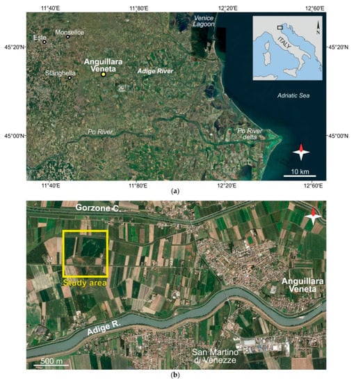 The investigated site is located near the village of Anguillara Veneta (Figure 1b), about 1 km north of the current channel of the Adige River, in an area with surface elevations ranging between 0.7 and 2.0 m asl, where traces of abandoned meanders are visible in several aerial images and could be followed for about 7 km, from Stanghella to Anguillara Veneta. These paleohydrographic traces run nearly parallel to the present Adige River, even if they are slightly out of the natural levee deposits connected to the fluvial ridge of Adige. The river activated its present direction since the early Middle Age, while before it used to flow along the meander belt running from Este to Monselice to Chioggia (from west to east) []. Near Anguillara Veneta, the present course of the Adige River cuts the so-called fluvial ridge of Rovigo–Saline–Cona, which was formed by the Po River between 4500 and 3500 years BP [].