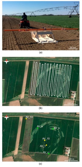 Methodologies. (a–b) Geophysical acquisition: (a) the electromagnetic tool on the wooden sledge dragged by a small tractor on the study field and (b) the survey path. (c) Position of the recovered cores. Yellow dots and green triangles indicate the hand auger core and the drilled cores with rotary technique, respectively.