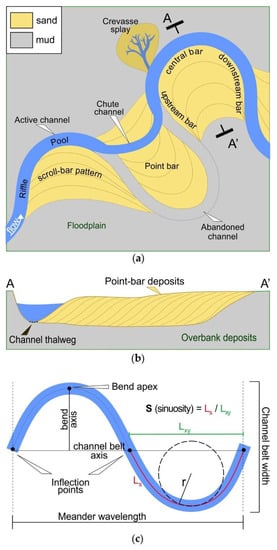 - Ghinassi, M.; Nemec, W.; Aldinucci, M.; Nehyba, S.; Özaksoy, V.; Fidolini, F. Plan-form evolution of ancient meandering rivers reconstructed from longitudinal outcrop sections. Sedimentology 2014, 61, 952–977. [Google Scholar] [CrossRef]
