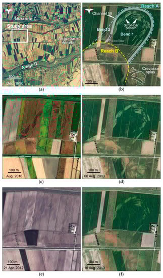 Remote-sensing results: (a) aerial photogram of the study area enhancing the poorly visible fluvial pattern during winter time; (b) meander belt reconstruction and fluvial morphology identification in the study area—white dashed lines highlight evidence of scroll-bar morphologies; and (c–f) satellite images (2016, 2013, 2012) providing information about fluvial morphology on the basis of seasons and soil use.