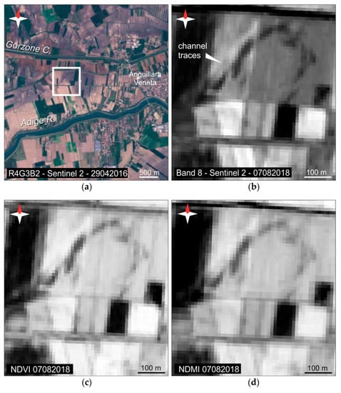 Processed satellite images: (a) RGB combination on Sentinel-2 image to highlight petrographic differences in the study area; (b) band 8, of Sentinel-2 image of the study area, showing paleochannel morphologies; and (c,d) NDVI and NDMI indexes calculated on Sentinel 2 images (2018), respectively, enhancing different plant health and hydraulic stress.